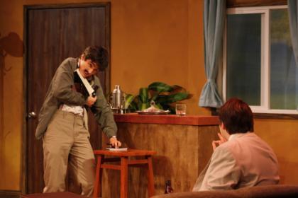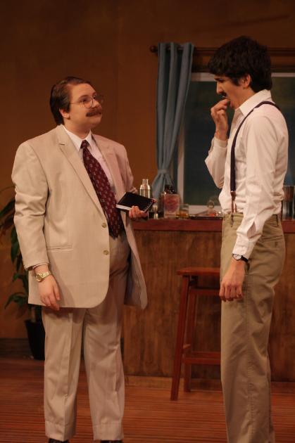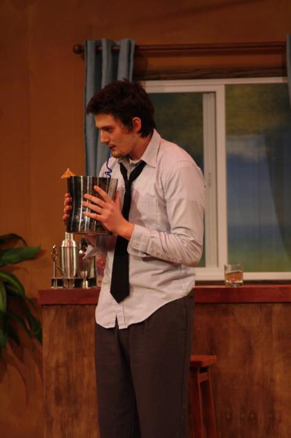 LU student performs A Masterpiece of Comic...Timing! for 2018-2019 season. There is one actor on the stage. He is standing in front of a bar counter and drinking from a very big metal cup.