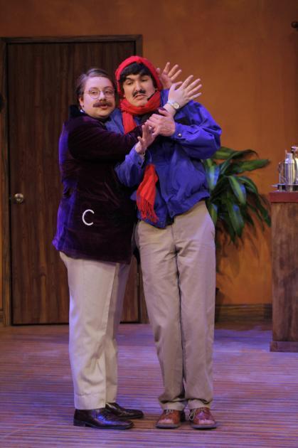 LU students perform A Masterpiece of Comic...Timing! for 2018-2019 season. Two student actors are on the stage next to each other. The first actor is looking at the audience while his hands are hugging the second actor. The second actor is reaching to the audience with his right hand.