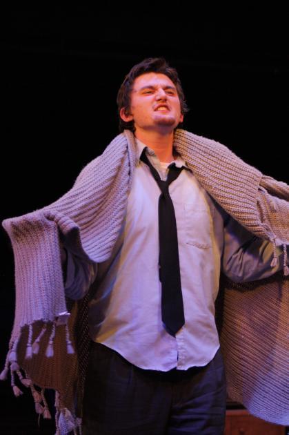 LU student performs A Masterpiece of Comic...Timing! for 2018-2019 season. The actor on the stage holds a blanket over his shoulders with open arms.