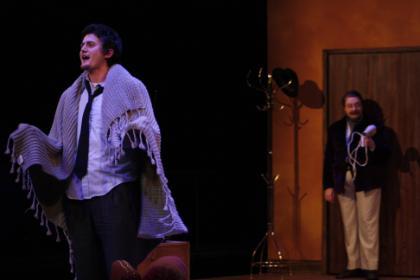 LU students perform A Masterpiece of Comic...Timing! for 2018-2019 season. One of the actors is in the background. He is standing by the door and looking at a hairdryer in his hand. The second actor is in the front of the picture. He is talking, and he has a blanket over his shoulders. His arms are open.