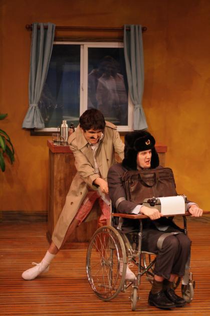 LU students perform A Masterpiece of Comic...Timing! for 2018-2019 season. There are two actors on the stage. One of them is in the wheelchair with a built in table. There is a typewriter and a briefcase on the table. The second actor is standing behind ad holding wheelchair's handles.