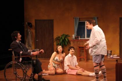 LU students perform A Masterpiece of Comic...Timing! for 2018-2019 season. Two actors in the front are talking to each other. One of the them is in a wheelchair. His hands are tied to the table, and there is a typewriter in front of him. Another actor is standing in front of the first one. A male and a female students are sitting on the floor in the background and listening to the conversation.