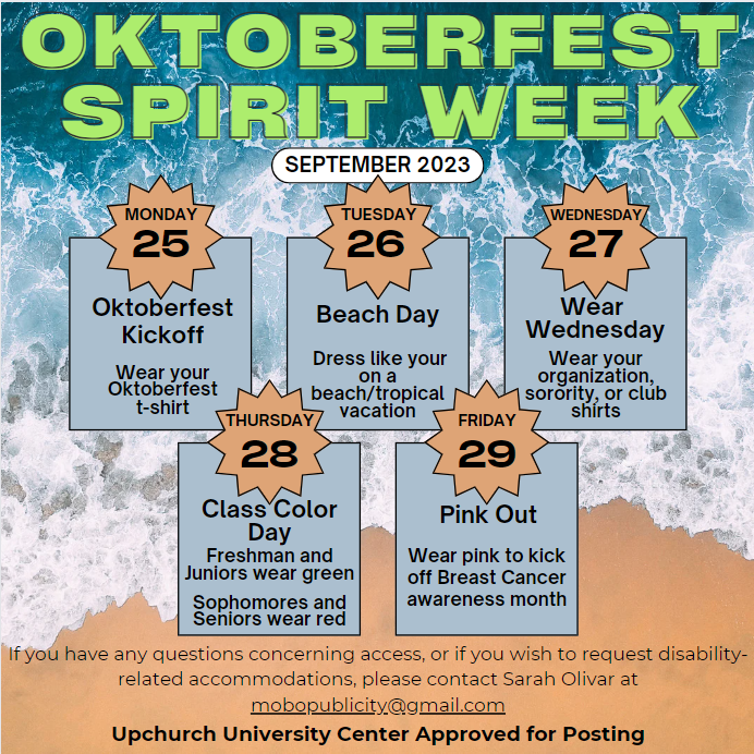 Monday: Oktoberfest Kickoff- wear your Oktoberfest t-shirt Tuesday: Beach Day- dress like you are on a beach/tropical vacation Wednesday: Wear Wednesday- wear your club or organization t-shirts Thursday: Class Color Day- freshman and juniors wear green, sophomores and seniors wear red Friday: Pink Out- wear pink to kick off breast cancer awareness month